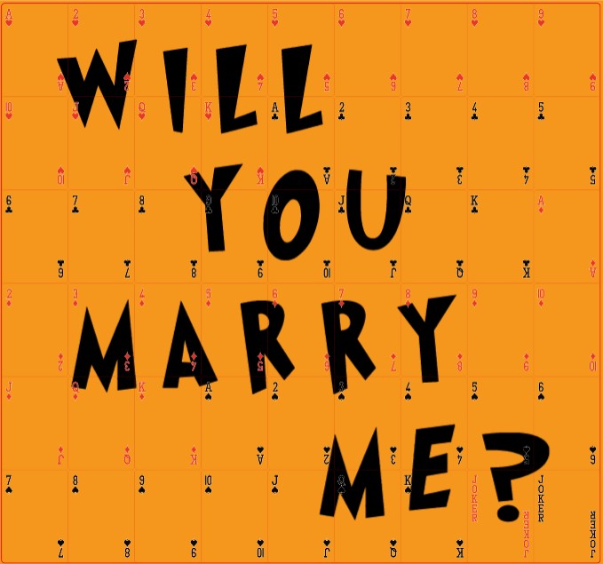 This is a very cool deck of cards. You can use 2 of your own images. When all 54 cards are assembled face up in a 9x6 grid on a table, the suits side of all the cards combine like a jigsaw puzzle to reveal your huge surprise photo! Individually the cards are a mystery as each card only represents 1 portion of the jumbo photo. The faces have the typical numbers and suits in the corners; top left and bottom right. They are red and black with a white outline so that they will be readable regardless of the background colour. Feel free to try it in the designer to get an idea of how it will look. You can use 2 images: 1 for the back of the cards and 1 larger image for the jumbo photo. The cards will make a jumbo image 22.5 inches wide X 21 inches tall.